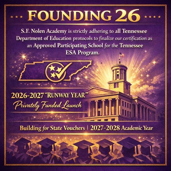 S.F. Nolen Academy is strictly adhering to all Tennessee Department of Education protocols to finalize our certification as an Approved Participating School for the Tennessee ESA Program. While our inaugural 2026-2027 'Runway Year' is privately funded to ensure a high-standard launch, we are building the regulatory infrastructure to accept state vouchers for the 2027-2028 academic year.